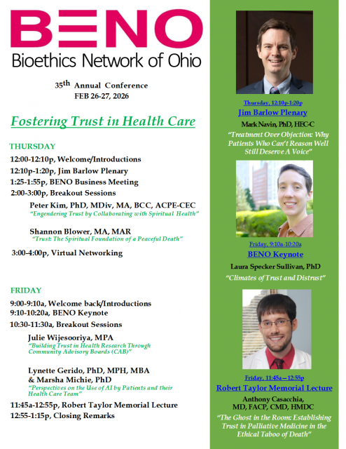 BENO is a statewide association of health care professionals, chaplains, attorneys, and academics all of whom have an active interest in ethics issues concerning medicine, patient care, policy, and law.